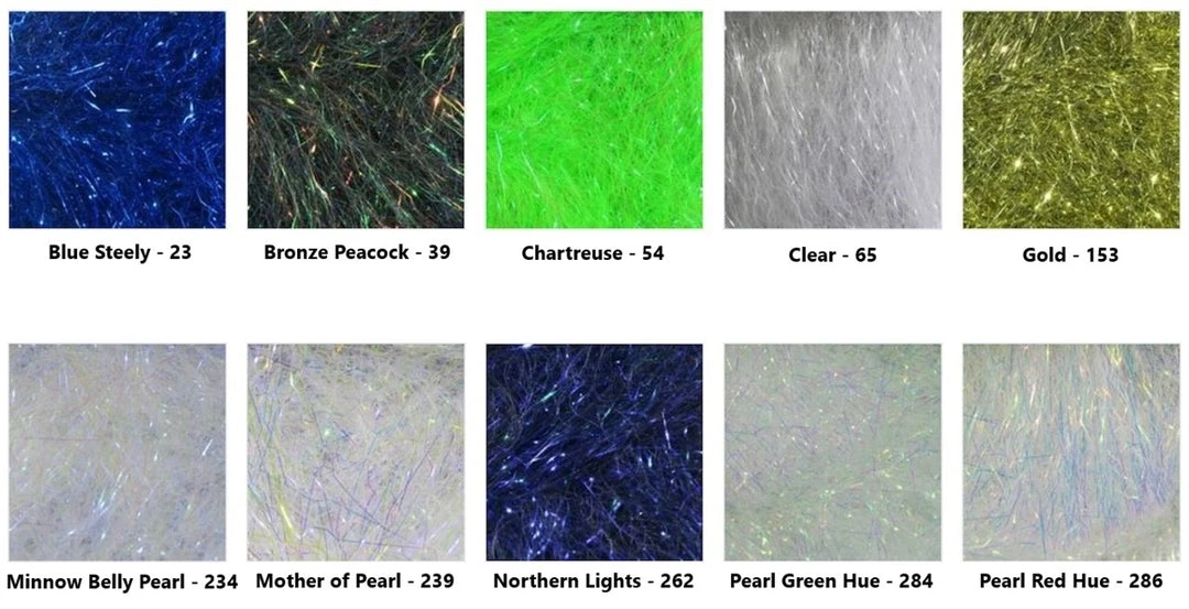 | Color | Black, Blue Steely, Bronze Peacock, Chartreuse, Clear, Gold, Minnow Belly Pearl, Mother of Pearl, Northern Lights, Pearl Green Hue, Pearl Red Hue, Shell Pink, Silver, UV Pearl |
