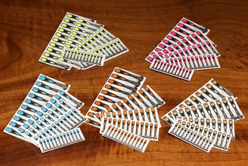 UV colored imitation jungle cock eyes. 5 sizes per pack: 12-Mini, 12-Small, 10-Medium, 10-Large, 10-X-Large
