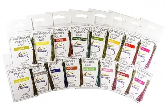 Hand stripped peacock quills. Non-bleached, durable and clean hand-stripped peacock quills. Any chironomid or buzzer fisherman’s must-have material!