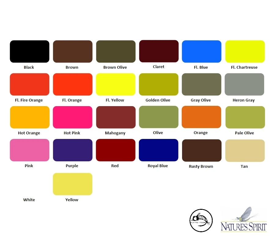 | Color | Brown, Brown Olive, Claret, Crawfish Orange, Fl. Blue, Fl. Chartreuse, Fl. Green, Fl. Hot Pink, Gray Olive, Light Olive, Olive, Orange, Purple, Red, Tan, White, Yellow, Black |