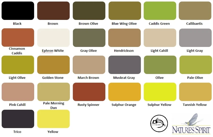 | Color | Brown, Brown Olive, BWO, Caddis Green, Callibaetis, Cinnamon Caddis, Ephron White, Gray Olive, Hendrickson, Light Cahill, Light Gray, Light Olive, March Brown, Muskrat Gray, Olive, Pale Olive, Pink Cahill, PMD, Rusty Spinner, Sulphur Orange, Tannish Yellow, Trico, Yellow, Black, Pale Yellow |