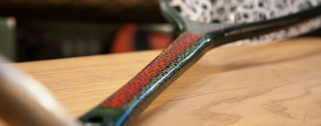 The Nomad Emerger net was designed to work with both packs and vests. The longer handle can easily tuck behind a pack but is not too long to hang off the back of a vest. This limited edition features a handled inspired by the wild Redband trout of the western US.